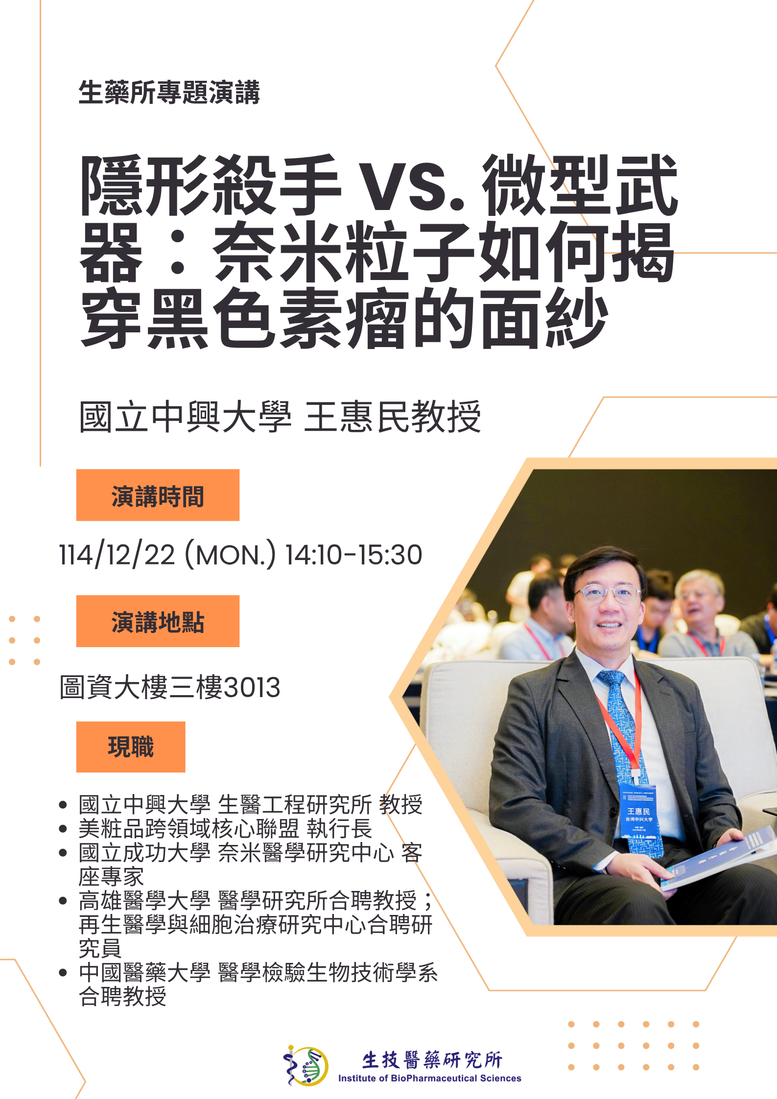 【專題演講】隱形殺手 vs. 微型武器:奈米粒子如何揭穿黑色素瘤的面紗-王惠民 教授(國立中興大學)(114/12/22)